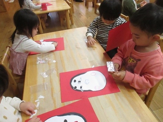 福笑いの制作では、顔の土台を見せると「のっぺらぼう!」と言ったり、目を丸くして不思議そうに見る様子がありました。