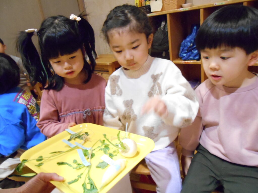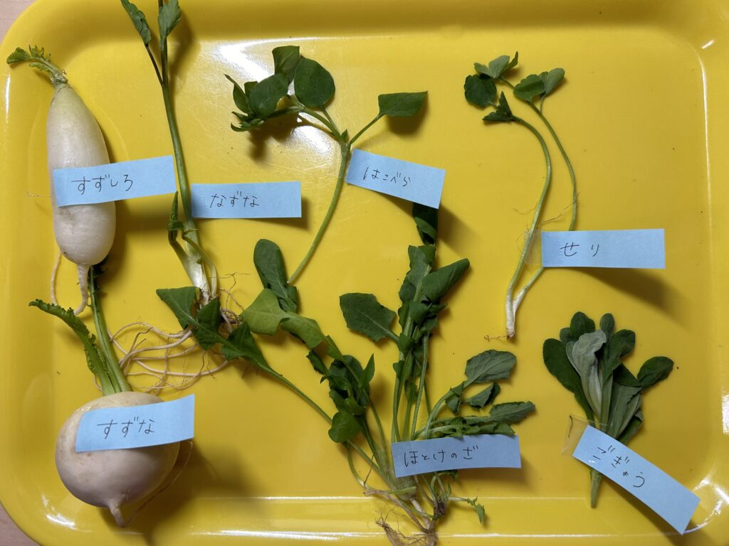 すずなやすずしろは「ちっちゃい大根だ」「かわいいカブだね」と興味深そうに七草に触れていました。