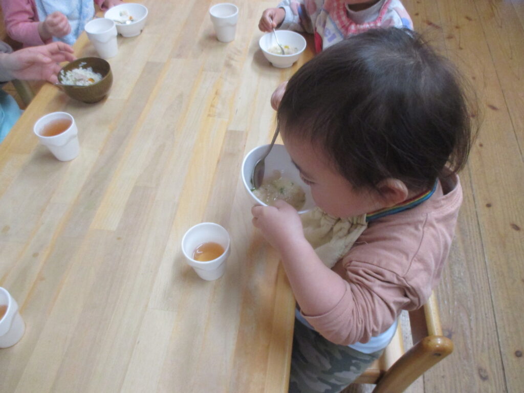おやつに出た七草がゆは「おいしい!」とおかわりもしてくれて、見事に全クラス完食!