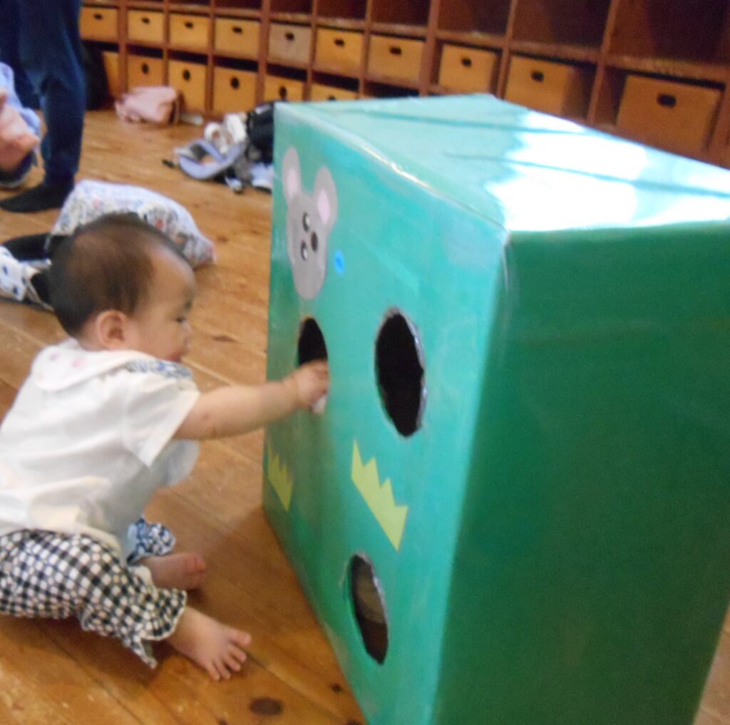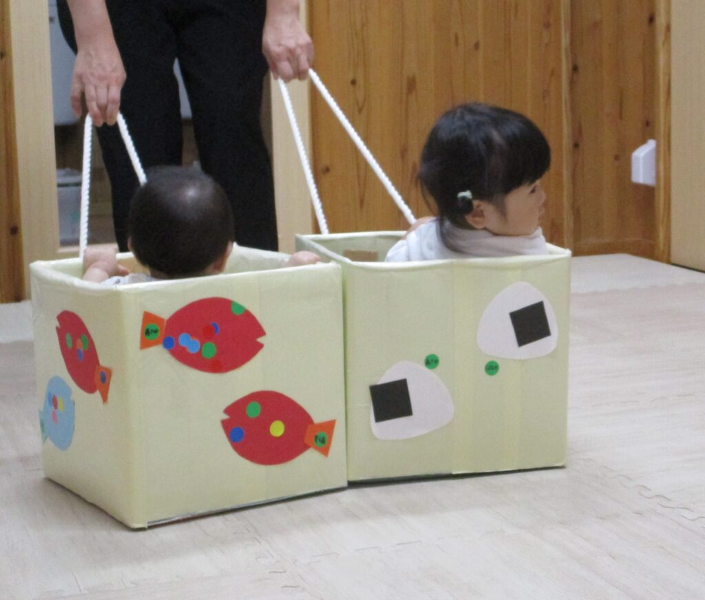 保育の中でもおむすびころりんのおむすび入れやトンネルくぐり、おむすびバスを準備しました。