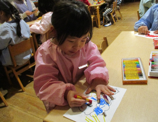 豆まきに向けて子ども達はそれぞれの≪心の中の鬼≫を考え、描き出しました。